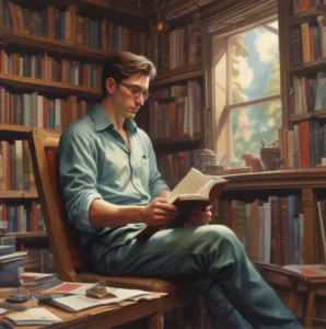 C. He reads and reads and reads to quench his thirst for knowledge.