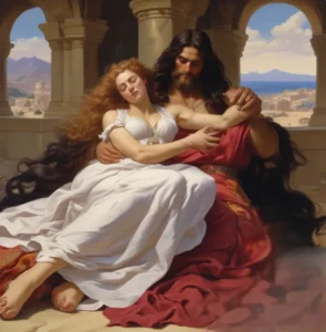 سامسون که روي بازوهاي دليله تکيه داده بود آشکار ساخت که راز نيرويش در موهای بلندش است.
