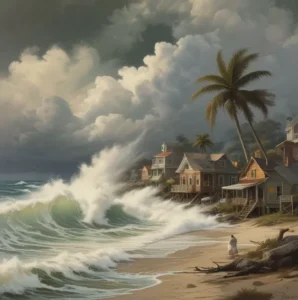 A. The hurricane’s violent winds brought disaster to the coastal town.