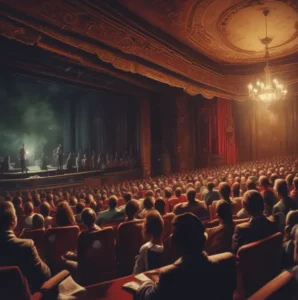 وقتی که پرده بالا رفت، همهمه ی بين حضار به پايان رسيد.