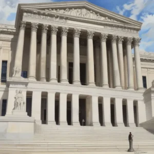 مجسمه بیرون ساختمان دادگاه، نماد عدالت تلقی می شود (درنظرگرفته می شود).